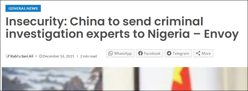 【編譯/觀察者網 李煥宇】據尼日利亞通訊社(NAN)12月16日報道,由於擔心尼日利亞的安全局勢,中方將派遣一個由刑偵專家組成的高級別代表團訪尼,同尼日利亞安全機構會晤。