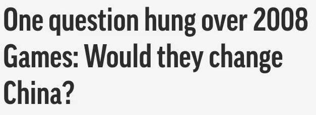 2008年奧運會在北京舉行之前,西方記者就發表了無數文章,講述國際關注將對中國社會和政府造成壓力,迫使中國改變在民族、宗教、人權等問題上的立場,並將中國轉變為西方式民主國家——一個更有可能受到西方思想和西方政治影響的國家。然而,這並沒有真正發生。