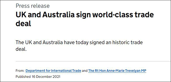 早在今年6月,英澳兩國政府就圍繞此項自貿協議達成了原則上的一致。經後續談判,兩國終於在當地時間16日晚正式簽署該協定。