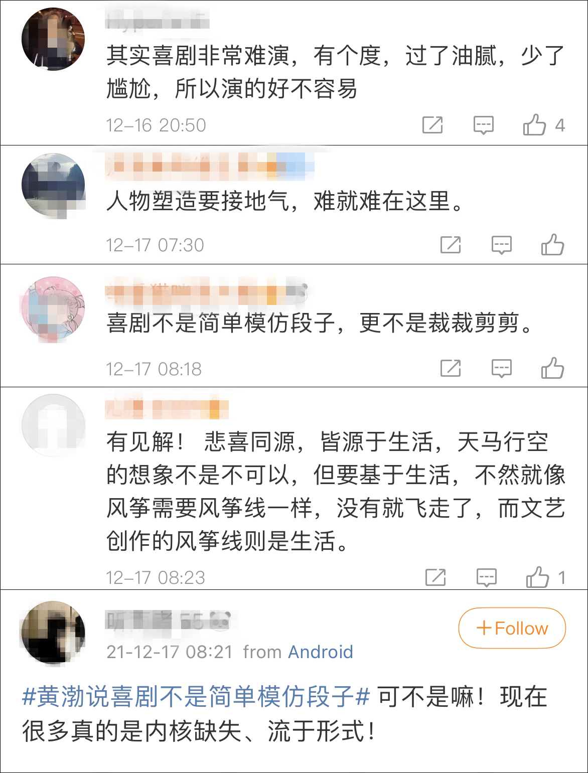 這些觀點獲得了不少網友的支持,有人留言稱“喜劇不是簡單模仿段子,更不是裁裁剪剪”,不能“流於形式”。