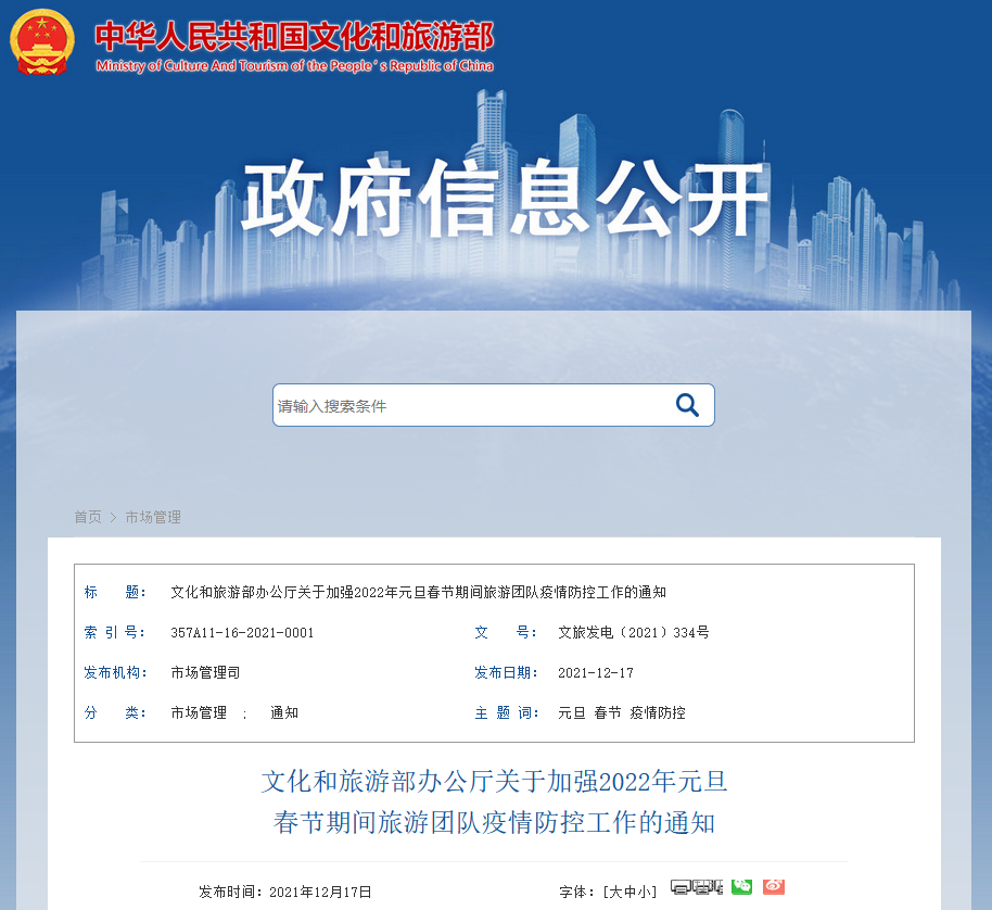 12月17日,文旅部網站發佈文化和旅遊部辦公廳關於加強2022年元旦春節期間旅遊團隊疫情防控工作的通知。全文如下: