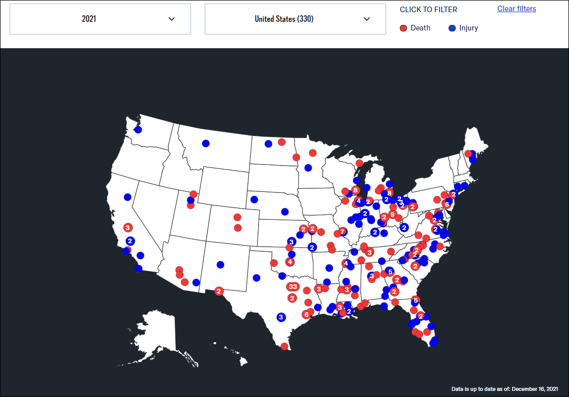 紅色代表死亡事件,藍色代表受傷事件,圖截自“Everytown for Gun Safety”網站