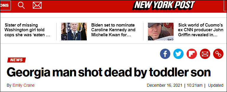《每日郵報》:佐治亞州25歲的父親在家中被他一歲的兒子開槍打死