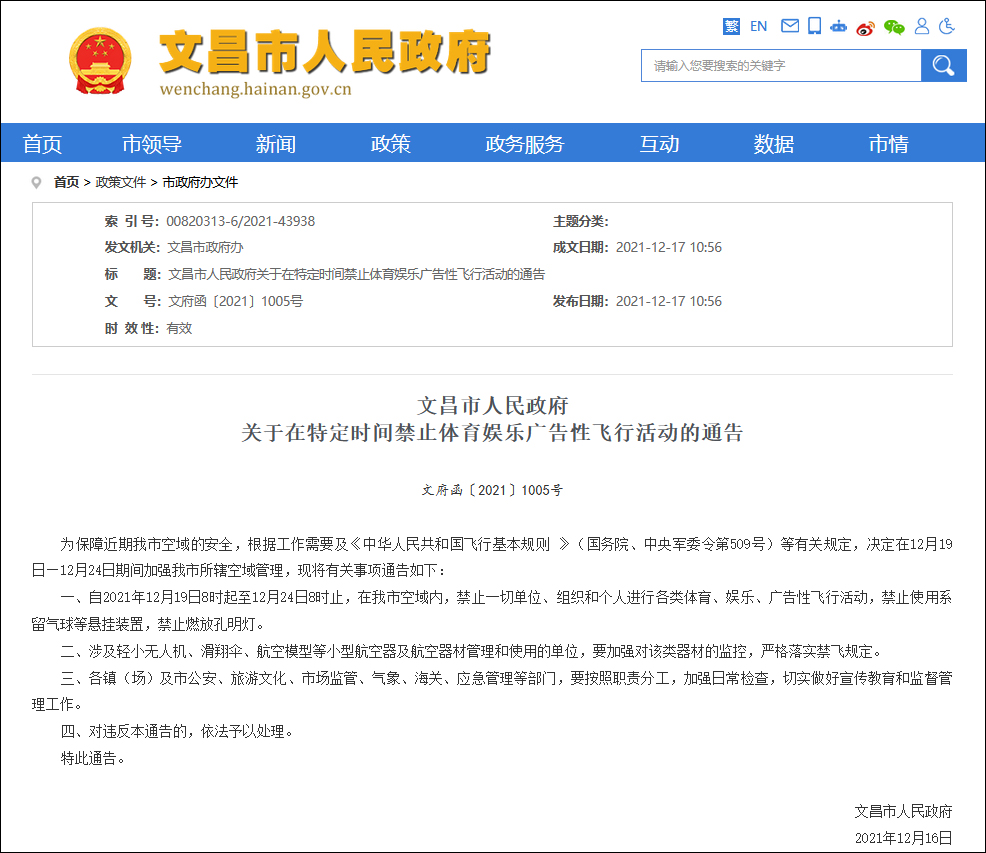 一、自2021年12月19日8時起至12月24日8時止,在文昌市空域內,禁止一切單位、組織和個人進行各類體育、娛樂、廣告性飛行活動,禁止使用繫留氣球等懸掛裝置,禁止燃放孔明燈。