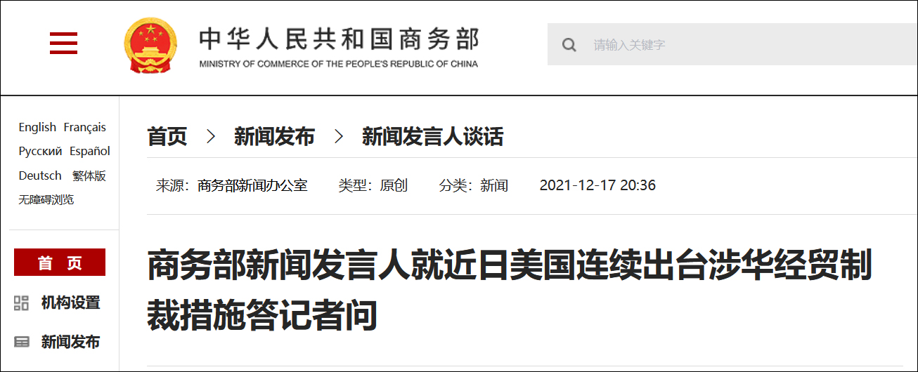 據商務部網站12月17日消息,商務部新聞發言人就近日美國連續出台涉華經貿制裁措施答記者問。