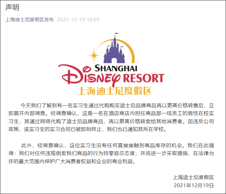 今天,上海迪士尼瞭解到有一名實習生通過代購購買迪士尼品牌商品再以更高價格轉售後,立即展開內部調查。經調查確認,這是一名在酒店商店內擔任商品部一線員工的男性在校實習生,其通過網絡代購了迪士尼品牌商品,再以更高價格轉賣給其他消費者。因違反公司政策,該實習生的實習合同已被即刻終止,上海迪士尼也已通知其所在學校。