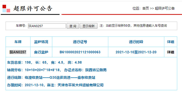 該車於12月10日在陝西省公路局辦理的超限許可顯示,其監護方式為自行監護,通行路線為“臨潼收費站——G30連霍高速——秦東收費站”,通行時段為2021年12月10日至2021年12月20日。車貨總重198噸, 長65米, 寬4.5米, 高4.98米。系天津市平發大件運輸有限公司車輛。其所運貨物為換熱器油箱,貨物重量為184噸。