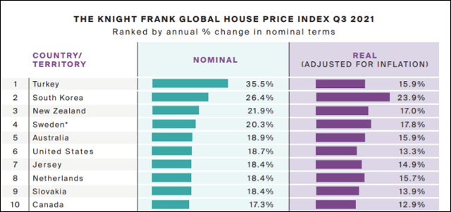 56個國家以實際漲幅為標準,總體房價漲幅為9.6%,繼第二季度9.2%的紀錄後持續高漲。除馬來西亞(-0.7%)和摩洛哥(-2.3%)外,其他54個國家房價均呈上漲趨勢。