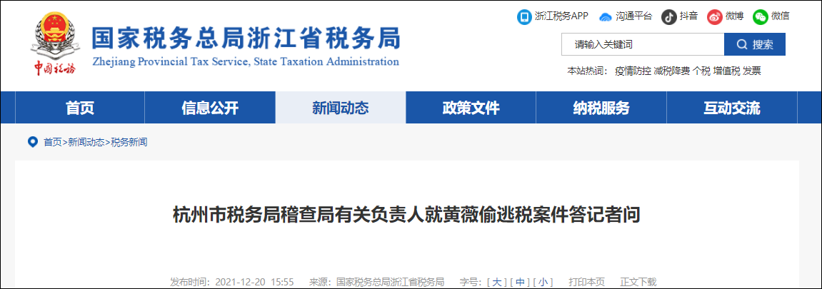 杭州市税務局稽查局有關負責人就黃薇偷逃税案件答記者問