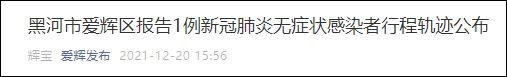 微信公眾號“愛輝發佈”消息,2021年12月19日21時,黑龍江黑河市愛輝區在每週一次的全員核酸篩查中檢出一混管陽性,12月20日2時經黑河市疾控中心實驗室單人單管檢測,檢出陽性病例1人。當日轉至定點醫院隔離治療,結合臨牀檢查,經醫療專家組診斷為無症狀感染者。