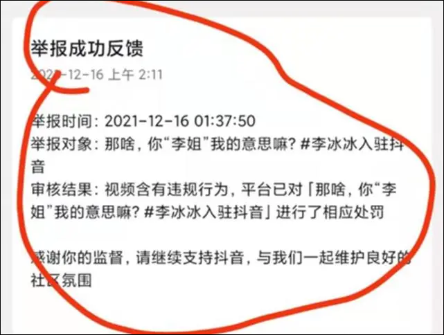據極目新聞此前報道,12月19日晚,李冰冰一條短視頻被舉報,舉報人告訴極目新聞記者,他很喜歡李冰冰,當時只是覺得李冰冰作為公眾人物,穿衣不妥,過於暴露,擔心會對青少年產生不良影響。舉報人馬先生説,他對李冰冰視頻的舉報順利通過了視頻平台的審核。平台給予的回覆是視頻確含有違規行為,已對其進行處罰。