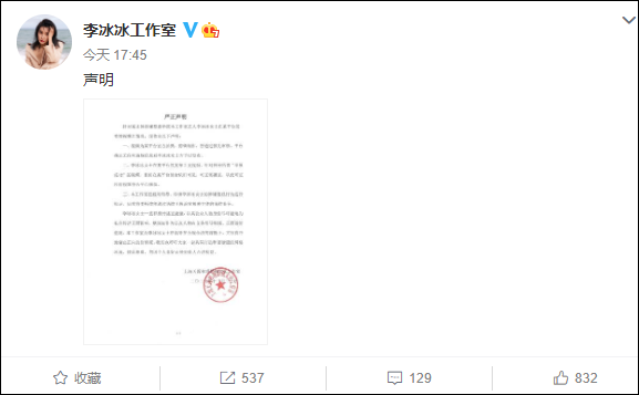 李冰冰工作室回應視頻被舉報:系侮辱誹謗,所有視頻符合平台規範