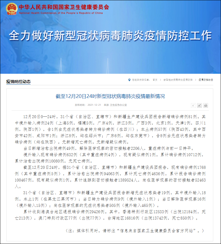 據國家衞健委官網12月21日消息,12月20日0—24時,31個省(自治區、直轄市)和新疆生產建設兵團報告新增確診病例81例。其中境外輸入病例24例(上海5例,福建5例,廣東4例,浙江3例,廣西3例,北京1例,天津1例,四川1例,陝西1例),含1例由無症狀感染者轉為確診病例(在四川);本土病例57例(陝西43例,其中西安市42例、咸陽市1例;浙江8例,均在紹興市;廣東6例,均在東莞市),含8例由無症狀感染者轉為確診病例(均在陝西)。無新增死亡病例。無新增疑似病例。