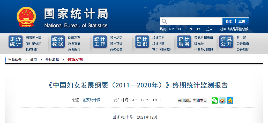 國家統計局網站12月21日發佈《中國婦女發展綱要(2011—2020年)》終期統計監測報告(下稱報告)。