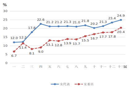 1.全國女人大代表和女政協委員佔比均達歷史最高。《綱要》實施以來,我國積極推動和支持婦女參政議政,婦女參與決策和管理的比例明顯提高,婦女的政治權利得到有力保障和加強。2018年召開的第十三屆全國人民代表大會共有女代表742名,佔代表總數的24.9%,比第十一屆(2008年)提高3.6個百分點,是歷屆人大代表中女性比重最高的一屆(見圖5)。政協第十三屆(2018年)全國委員會中有女委員440人,佔委員總數的20.4%,比第十一屆(2008年)提高2.7個百分點,也是歷屆政協委員中女性比重最高的一屆(見圖5)。