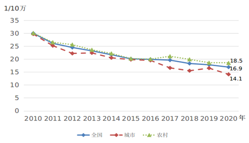 雖然我國婦女健康水平有了較大提高,但是城鄉間差距依然存在。2020年,農村孕產婦死亡率為18.5/10萬,比2010年降低38.5%,但仍高於城市14.1/10萬的水平。