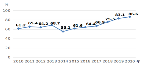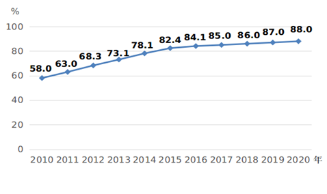 圖8 2010—2020年全國農村集中式供水受益人口比重