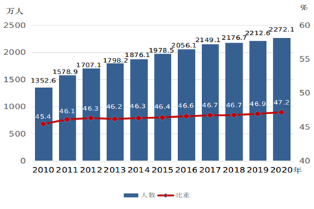 2.女性參加醫療保險的人數大幅增加。近年來,我國在城鄉婦女基本醫療保障實現制度全覆蓋的基礎上,通過整合城鄉居民醫療保險,完善城鄉醫療救助和補充醫療保險制度,進一步完善多層次醫療保障體系,使更多女性享有更公平的醫療保障。2020年末,全國女性參加基本醫療保險的人數為6.5億人,是2011年末的3.4倍;其中,參加職工基本醫療保險的人數為1.6億人,比2010年末增加5801.8萬人,增長55.1%;參加城鄉居民基本醫療保險的人數為4.9億人,比2011年末增加4.1億人,是2011年末的6.5倍。