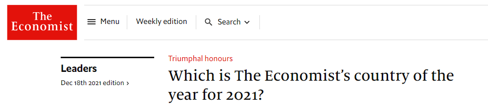 《經濟學人》表示,“年度國家”不是頒發給最龐大的、最富有或者最有幸福感的主體,而是頒發給“在我們看來2021年進步最大的”主體。該獎項過去的獲得者包括烏茲別克斯坦、哥倫比亞和突尼斯。