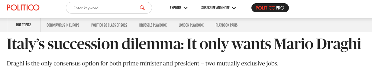 在西方政界和輿論看來,德拉吉(Mario Draghi)後續會擔任總統還是總理職務,充滿爭議。意大利正因此面對不確定性風險。此外,在意大利工會和民眾看來,德拉吉政府的經濟政策沒有使社會財富得到再分配,沒有減少社會不平等現實問題。