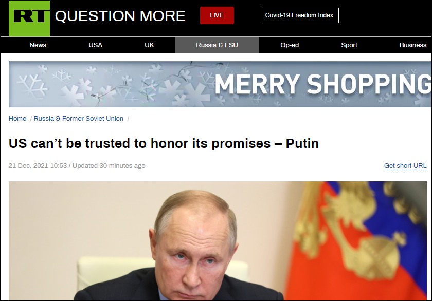 據“今日俄羅斯”電視台(RT)12月21日報道,普京當天正在向高級軍官發表講話,他説自己不再將西方視為可靠的合作伙伴。儘管俄羅斯一直在尋求能夠獲得限制美國軍隊在俄邊境附近部署的書面保證,但即便有這種保證也不靠譜。