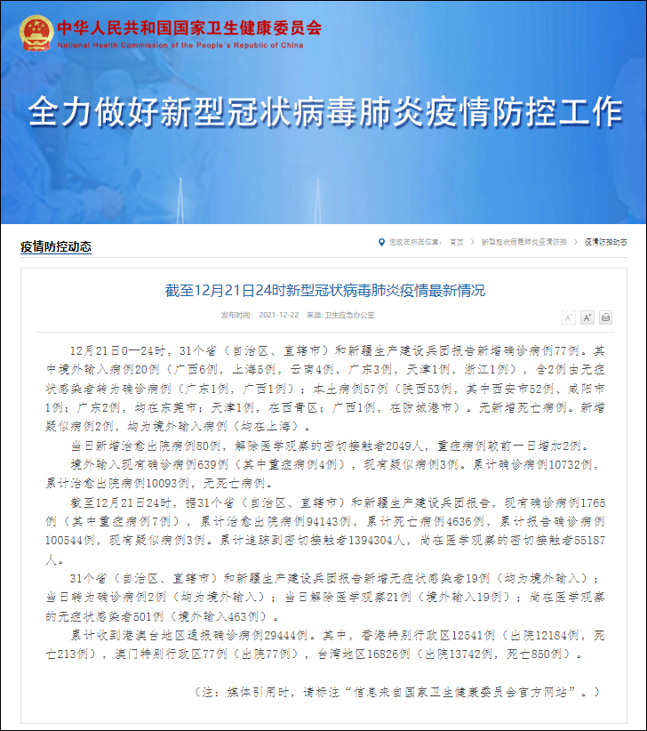 據國家衞健委官網12月22日消息,12月21日0—24時,31個省(自治區、直轄市)和新疆生產建設兵團報告新增確診病例77例。其中境外輸入病例20例(廣西6例,上海5例,雲南4例,廣東3例,天津1例,浙江1例),含2例由無症狀感染者轉為確診病例(廣東1例,廣西1例);**本土病例57例(陝西53例,其中西安市52例、咸陽市1例;廣東2例,均在東莞市;天津1例,在西青區;廣西1例,在防城港市)。無新增死亡病例。**新增疑似病例2例,均為境外輸入病例(均在上海)。