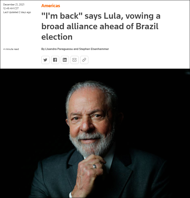 路透社20日報道,2022年10月2日,巴西將舉行總統大選。盧拉12月17日在位於聖保羅市的辦公室接受採訪,談及他自己的未來時,盧拉直截了當表示:“我回到了遊戲(政壇)中。我想玩,我想贏。”盧拉表示,他若當選總統,政府將提供更加公平的財富分配,縮小社會貧富差距,並建立一個廣泛的聯盟,團結深度分裂的國家。