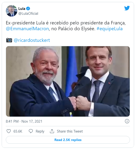 盧拉11月17日在社交媒體上稱,在巴黎愛麗捨宮受到法國總統馬克龍的接見。