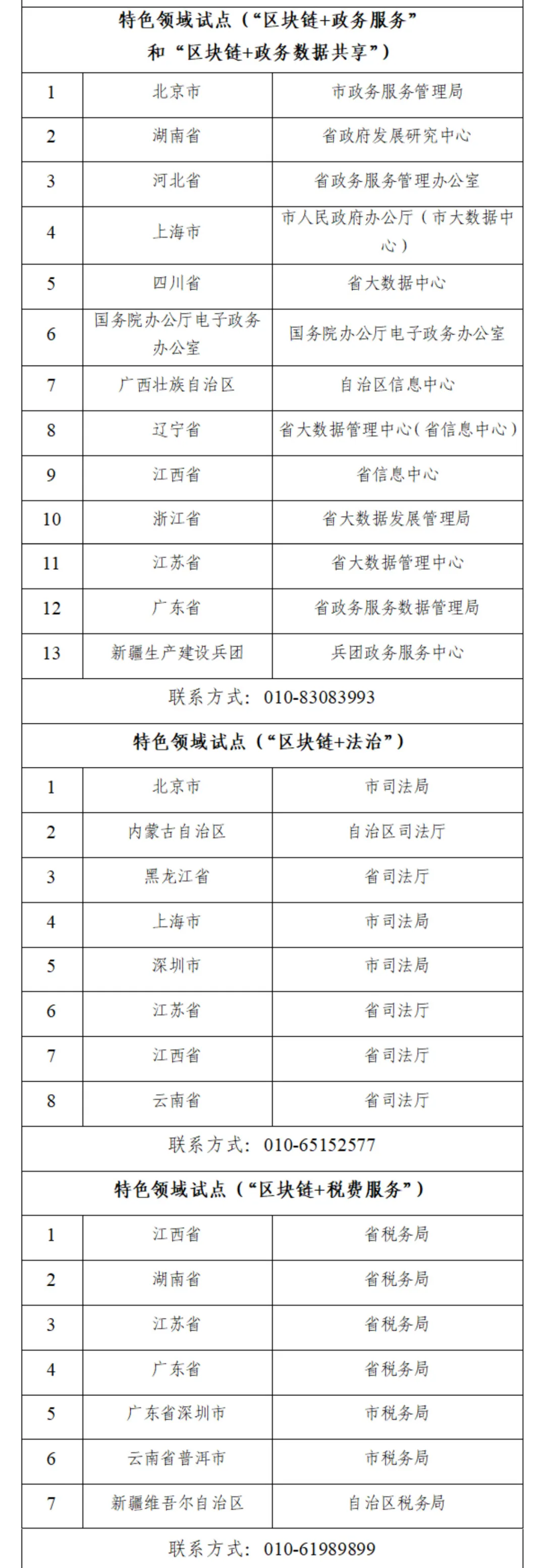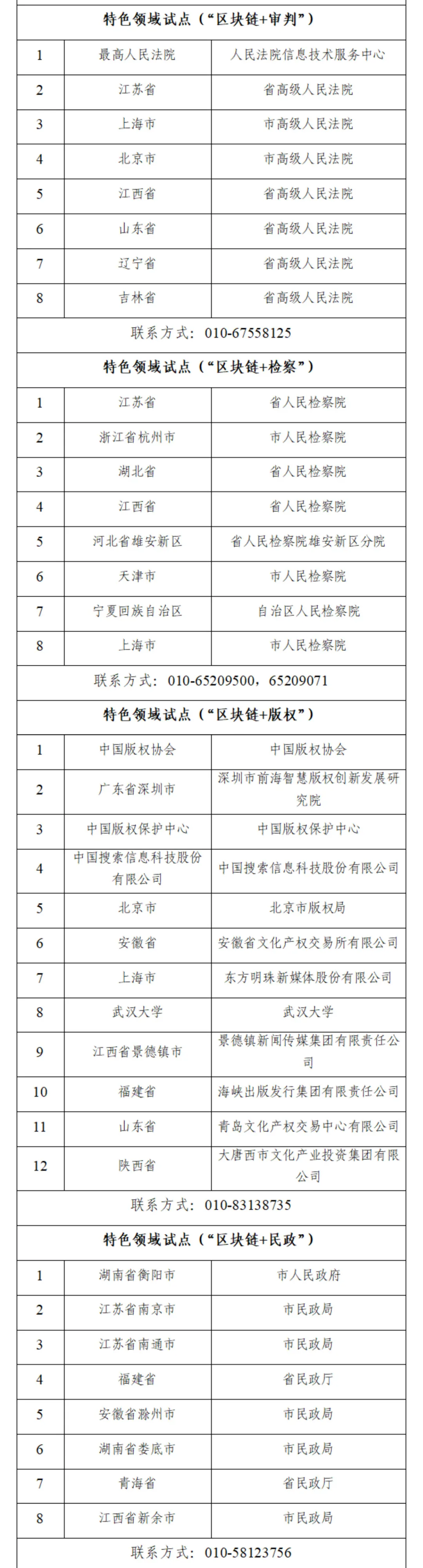 微信公眾號“網信中國”12月22日消息,根據《關於組織申報區塊鏈創新應用試點的通知》(中網辦秘字〔2021〕1482號),中央網信辦、中央宣傳部、國務院辦公廳[電子政務辦公室]、最高人民法院、最高人民檢察院、教育部、工業和信息化部、民政部、司法部、人力資源社會保障部、國家衞生健康委、中國人民銀行、國家税務總局、中國銀保監會、中國證監會、國家能源局、國家外匯管理局等17個部門和單位對各地、各單位的申報材料組織了專家評審。現將入選名單予以公示,公示期為2021年12月22日至2021年12月28日。名單中各試點單位(地區)應遵循誠實信用原則,嚴禁弄虛作假,嚴禁借區塊鏈創新名義進行炒幣、挖礦、非法集資、洗錢、傳銷和炒作宣傳。如有異議,請在公示期內與我們聯繫,聯繫方式見附件。