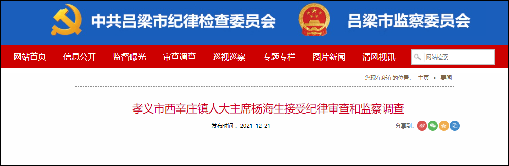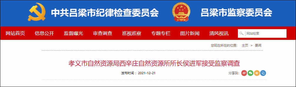 12月21日,呂梁市紀委監委網站發佈通報,孝義市西辛莊鎮分管礦業秩序的鎮人大主席楊海生和孝義市自然資源局西辛莊自然資源所所長侯進軍因涉嫌嚴重違紀違法,目前分別接受呂梁市紀委監委紀律審查和監察調查。