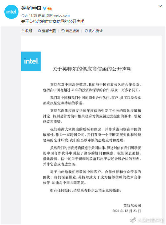 近日,美國企業英特爾在官網上致信廣大供應商,要求確保其供應鏈“不使用任何來自新疆地區的勞工、採購產品或服務”。在網上引發口誅筆伐之後,今天下午,@英特爾中國在微博上就此事發表公開聲明,在深表歉意的同時,又宣稱“信中關於新疆的段落只出於表述合規合法的初衷,並非它意或表達立場”。對於英特爾公司的回覆,廣大網友表示並不買賬。