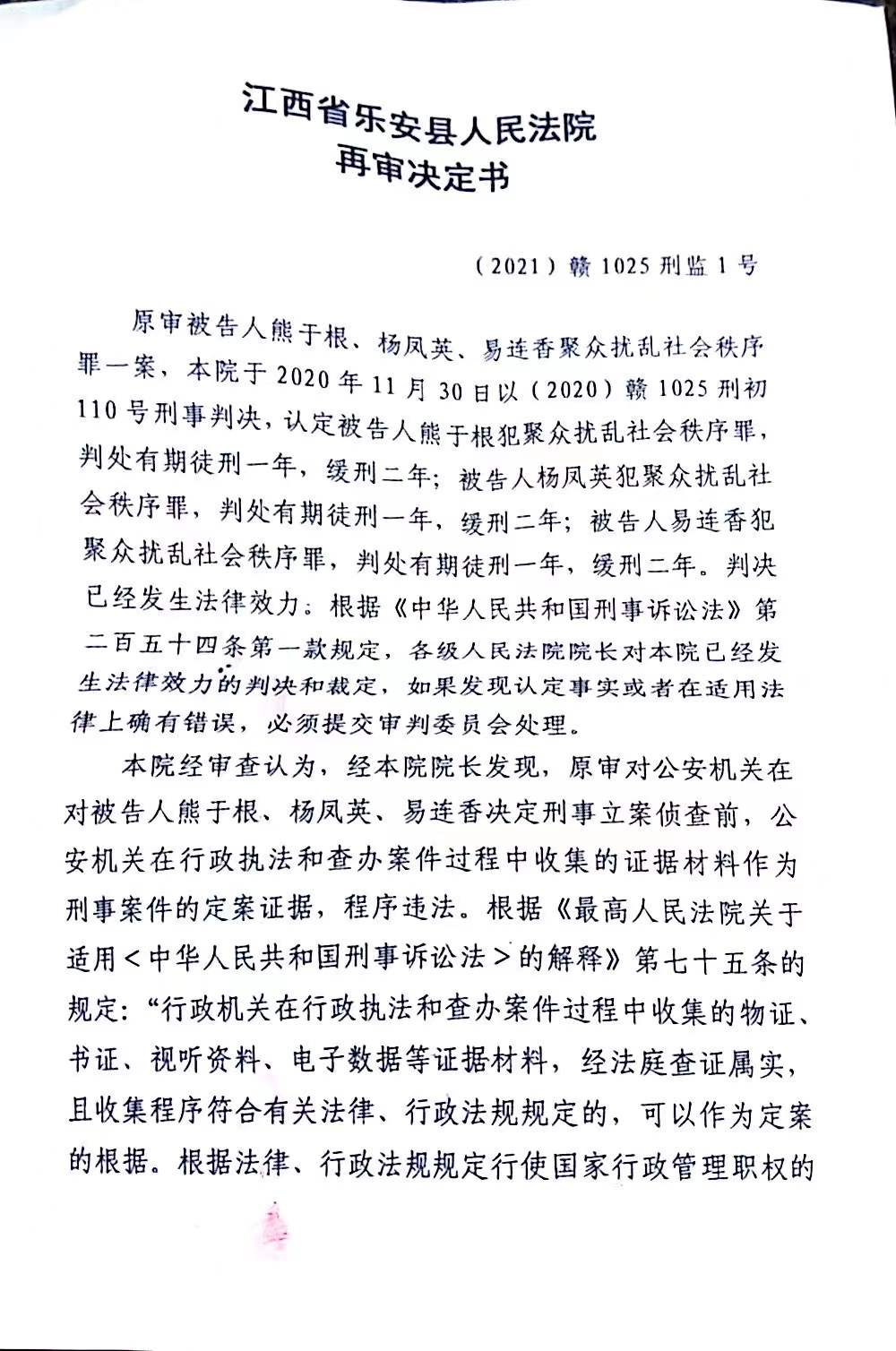 因不服判決,四人不斷申訴。12月23日,澎湃新聞從熊智超代理律師處獲悉,撫州中院已於近日受理熊智超的申訴。與此同時,原審法院——樂安縣法院也已於12月21日作出再審決定,對熊於根、楊鳳英和易連香三人涉嫌聚眾擾亂社會秩序罪一案另組合議庭進行再審。