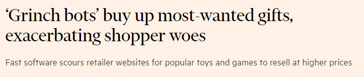 “聖誕怪傑機器人”可以提前鎖定目標商品(例如消費者最喜歡的節日禮物),它們一旦上架,這款程序就可以將它們搶購一空。文章稱,“聖誕怪傑機器人”加劇了美國零售商的供應鏈危機。