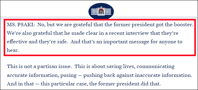 隨後,在當地時間23日的例行記者會上,白宮新聞秘書普薩基也感謝了特朗普的這些言行。普薩基稱:“我們感謝前總統注射了加強針。我們也很感謝他在最近的一次採訪中明確表示,疫苗有效且安全。 這對所有人來説都是一個重要的信息。 ”
