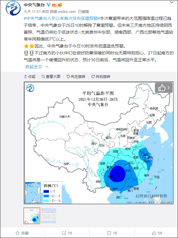12月26日,@中央氣象台 入冬以來首次發佈低温預警。本次寒潮帶來的大範圍強降温過程已趨於結束,中央氣象台於26日10時解除了寒潮預警。但未來三天南方地區持續陰雨寡照,氣温仍將處於低迷狀態,尤其貴州中東部、湖南西部、廣西北部等地氣温較常年同期偏低7℃以上。因此,中央氣象台於今日10時發佈低温藍色預警。