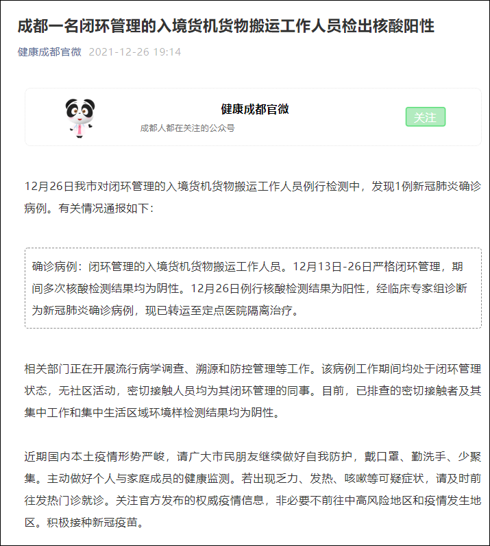 微信公眾號“健康成都官微”消息,12月26日成都市對閉環管理的入境貨機貨物搬運工作人員例行檢測中,發現1例新冠肺炎確診病例。有關情況通報如下: