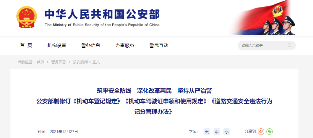公安部網站12月27日消息,為主動適應經濟社會發展的新形勢,不斷滿足人民羣眾對安全便捷高效公共服務的新需求,近日,公安部發布了新制修訂的《機動車登記規定》《機動車駕駛證申領和使用規定》《道路交通安全違法行為記分管理辦法》3個部門規章。