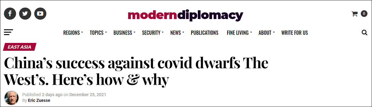 (觀察者網訊)12月25日,歐洲《現代外交》網站(ModernDiplomacy.Eu)刊登一篇題為《中國抗擊疫情的成就令西方相形見絀,以下為方式和原因》的文章。作者、調查歷史學家埃裏克·蘇伊斯(Eric Zuesse)通過對比中國與西方國家在抗疫政策與疫情數據上的差異,揭露西方對現實差距諱莫如深,甚至不願從中國學習經驗的現狀。