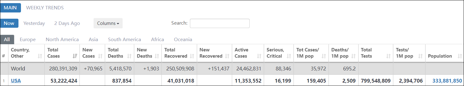 根據蘇伊斯提到的worldometers網站數據,截至2021年12月27日格林尼治標準時間11:11,美國新冠肺炎累計確診病例居於全球222個國家和地區之首,達到53222424例,累計死亡病例同樣居於首位,達到837854例。