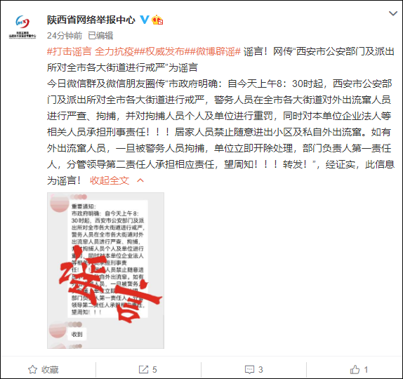 今日微信羣及微信朋友圈傳“市政府明確:自今天上午8:30時起,西安市公安部門及派出所對全市各大街道進行戒嚴,警務人員在全市各大街道對外出流竄人員進行嚴查、拘捕,並對拘捕人員個人及單位進行重罰,同時對本單位企業法人等相關人員承擔刑事責任!!!居家人員禁止隨意進出小區及私自外出流竄。如有外出流竄人員,一旦被警務人員拘捕,單位立即開除處理,部門負責人第一責任人,分管領導第二責任人承擔相應責任,望周知!!!轉發!”,經證實,此信息為謠言!