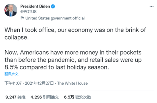 得知消息後,美國總統拜登第一時間發推,語氣頗為得意:“我上任時,我們的經濟正處於崩潰的邊緣。現在,美國人口袋裏的錢比疫情之前要多,零售額比上一個假日季增長了 8.5%。”