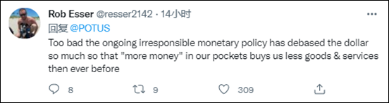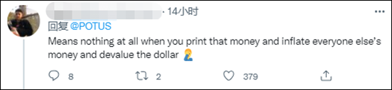 有美國網民在拜登最新自誇的推文下回嗆道:“在你印鈔票,通貨膨脹,讓美元貶值的時候,這一點意義都沒有。”