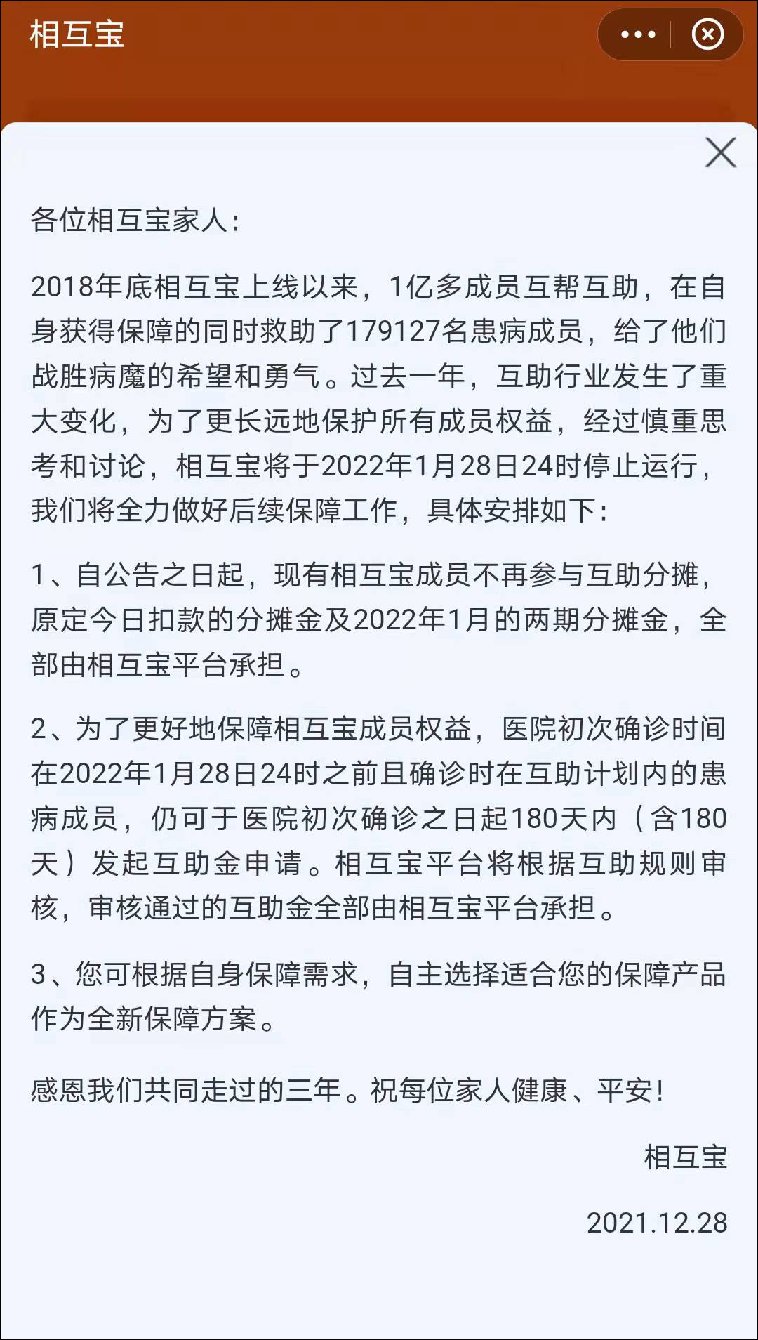 12月28日,相互寶官方賬號發佈公告稱,過去一年,互助行業發生了重大變化,為了更長遠地保護所有成員權益,經過慎重思考和討論,相互寶將於2022年1月28日24時停止運行。