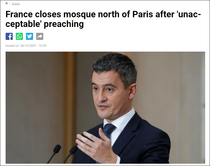 早在12月14日,法國政府就盯上了這座清真寺。當時,法國內政部長達爾曼寧宣佈,伊瑪目“針對基督徒、同性戀者和猶太人”的佈道內容“不可被接受”,因此,他已經啓動了關閉該清真寺的程序。