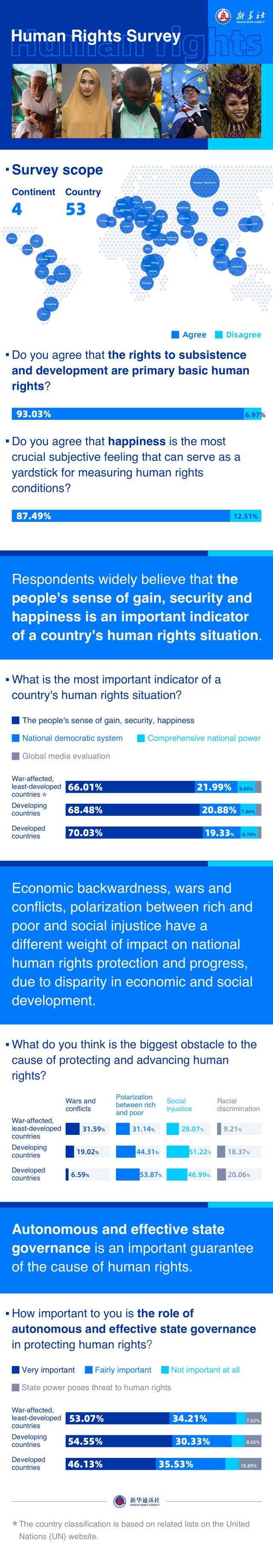 93%的受訪者認同“生存權和發展權是首要的基本人權”,認同“幸福生活”是衡量人權狀況的重要主體感受的人羣佔比超87%;認為自主而有效的國家治理對於人權保障事業“比較重要”和“極為重要”的人羣佔比在各類型國家中均超過80%……調查結果反映了海外受訪民眾在人權治理問題上的感受與看法,體現出一些共識性認知。