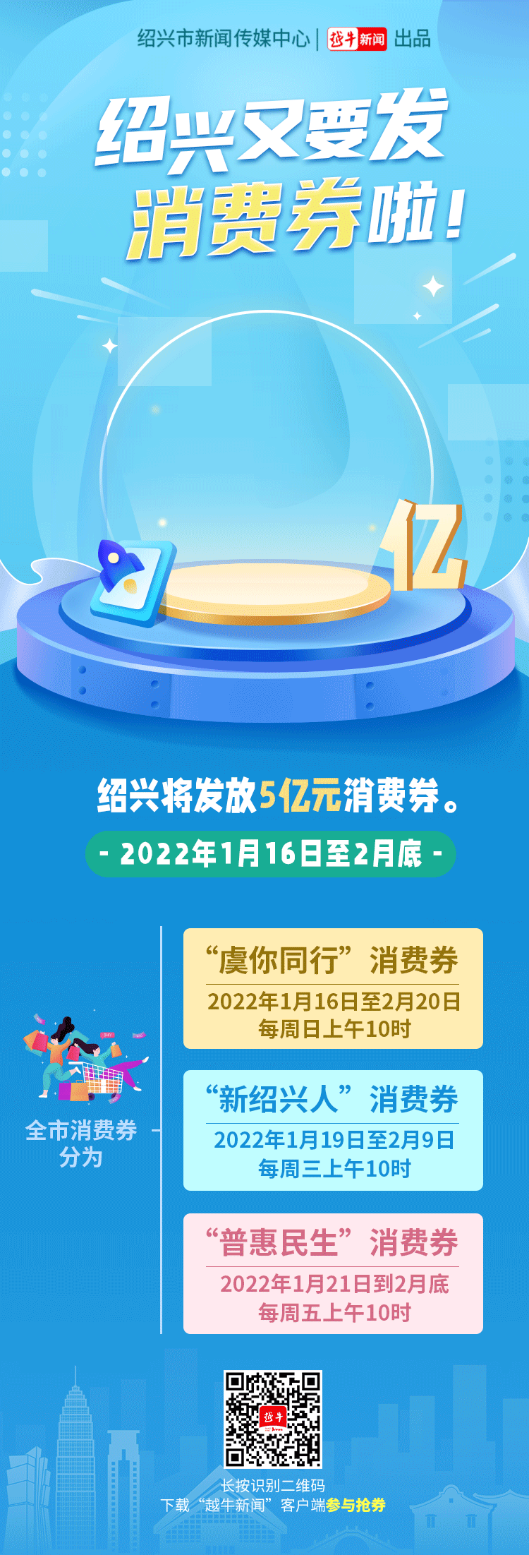消費券總投放資金5億元。其中,“虞你同行”消費券採用固定券包形式,安排資金8000萬元;“新紹興人”消費券採用固定券包形式,安排資金1.2億元;“普惠民生”消費券採用自選形式,安排資金3億元,包括“越味美食”券(僅限餐飲)、“越居美宿”券(僅限住宿)、“樂遊紹興”券(僅限文化旅遊)、其他通用券4類。