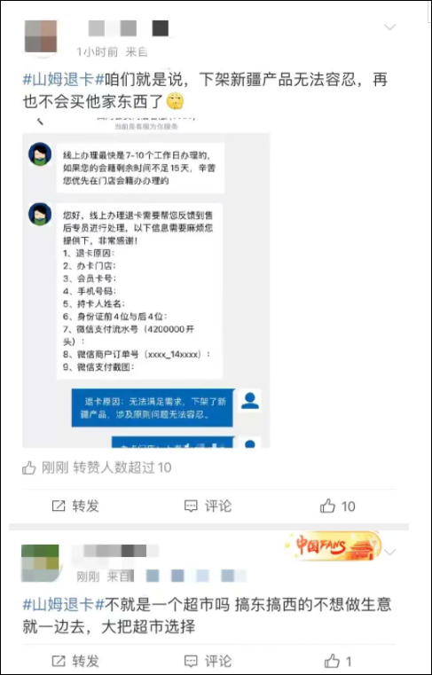 大批原山姆店會員在看到山姆店針對新疆的舉動後,選擇了退出會員、不再購買山姆任何產品。