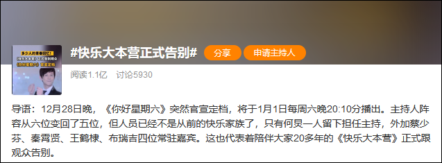 至此,許多網友在《你好星期六》的這條官宣微博下感慨,《快樂大本營》“真的消失了”。