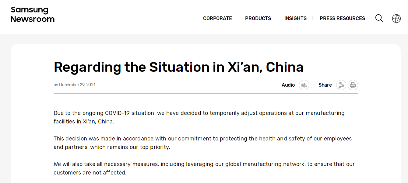 集邦諮詢的報告指出,受疫情影響,西安嚴控人流及物流,儘管三星2021年底至2022年1月中旬以前的閃存出貨大多已安排妥當,但無法排除接下來因物流延遲出貨的可能,這或許會對採購端的物料安排造成影響。此外,該公司的原材料進貨也有可能因物流受阻而延遲,但三星西安廠區內的庫存仍保持在安全水準,可以應付未來數月的生產。