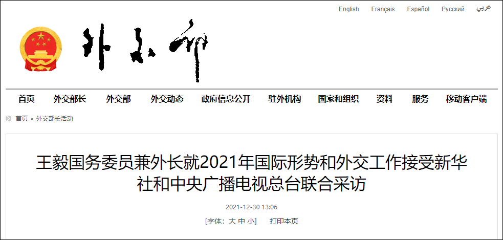 據外交部網站12月30日消息,2021年12月30日,國務委員兼外交部長王毅接受新華社和中央廣播電視總枱聯合採訪,就中美關係闡明立場主張。